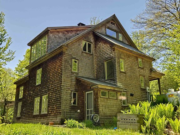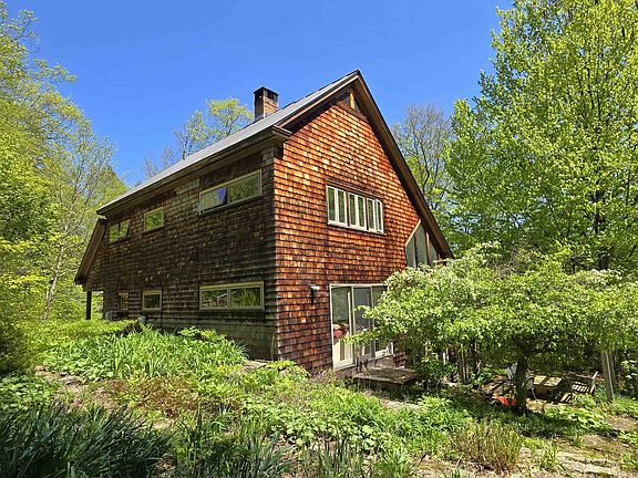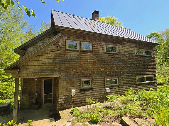 This artist/owner-designed, one-of-a-kind, multi-level residence is thoughtfully built into the natural slope of a serene & private 12-acre property, in highly sought-after Dummerston, VT. The custom, 6-level home offers an inspired blend of artisanal craftsmanship, premium materials, & contemporary design, w/each gracefully staggered level flowing along the long axis of the home. Premium, hand-selected materials are found throughout the home - cedar shake siding, standing seam metal roofing, copper-flashed windows, premium, oversized slate flooring & Vermont hardwood flooring. Enter the home on Level 2 via a modest mudroom, then into the sun-filled, south-facing LR, overlooking the stunning atrium. One level down, the expansive Kit, DR, & atrium space features custom cabinetry, a large island, a petite fireplace, & radiant slate flooring heat. The atrium soars to Level 5, bringing vertical openness & abundant light. Level 3 offers a large BR w/sliding windows to the atrium, & walk-in closet. Level 4 includes a full BA & a sun-filled, open artist studio. A vaulted-ceiling BR on Level 5 enjoys forest views; Level 6 serves as a treetop office. Levels 2–6 feature HW floors. Step outside to a moss-covered slate terrace w/pergola. ALSO, a 2-storey 50'x23' barn (maker space), a 3-bay shed, outbuildings, & optional commercial kiln. Owned solar panels & 2 Tesla Powerwalls provide energy resilience. An inspiring, one-of-a-kind Vermont retreat. 3rd BR used as Office. Delayed to 5/23.