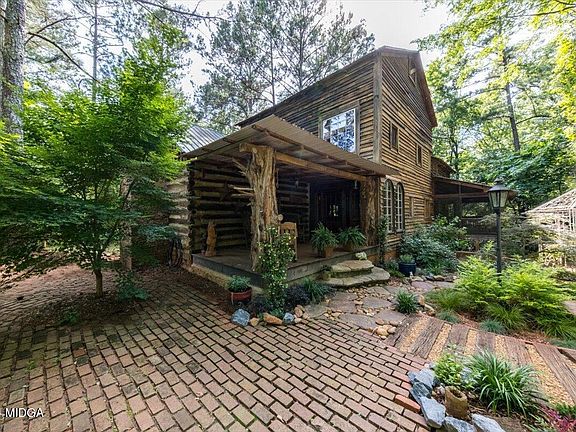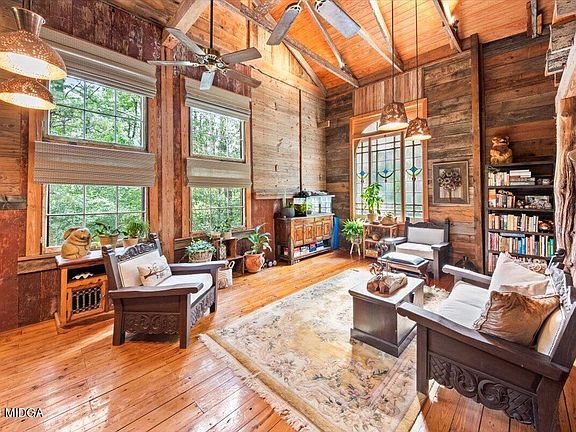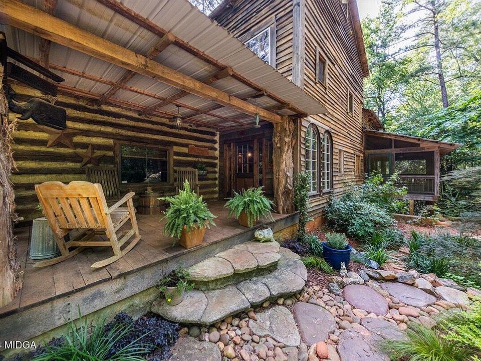 Step into a piece of history with this large 4 bedroom, 3 bathroom enchanting log home, meticulously crafted from two 1800's tobacco cabins moved from North Carolina, joined in the middle by a custom-built two-story central structure constructed with reclaimed lumber from a 1900's grist mill out of Alabama. The cabin has an inviting stone path leading to the front porch where friends can visit and sit a spell.