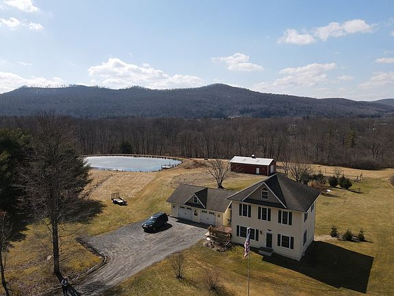 Dream do comes true! This well-built quality home is nestled in a private setting on a dead end secluded road. This home offers a lifestyle many can only dream about. This includes 11.16 surveyed acreage which includes a two story family home with a view to the stocked pond and the hills in the yonder. The interior features numerous large windows that fill the home with natural sunlight in each room. All levels including the basement flooring has radiant heat. Home has a side porch with a sliding doors to the private large rear deck which is perfect for casual affairs. The first level consists of a formal dining room, spacious living room with freestanding fireplace and a half bath/laundry room. The kitchen has stainless steel appliances with cabinets with many features including the convenient pull up mixer shelf. The second level consists of a master suite with the master bathroom with a soaking tub. This level additionally offers two other large bedroom's and another full bathroom.