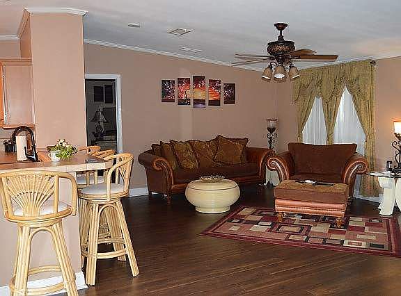 This is home!! Beautiful with double car garage. Pergo flooring throughout, carpeted 2nd and 3rd bedroom. Newer appliances, spacious kitchen with island counter and plenty of cabinets. Laundry room with utility sink, and entrance to garage. 1,536 sq. ft. living space plus 10x20 Florida room. Master bedroom a generous 12.8 x 14.6. Raintree Village located in Deland, many park amenities, low lot rent, near shopping and resturants. Call today!