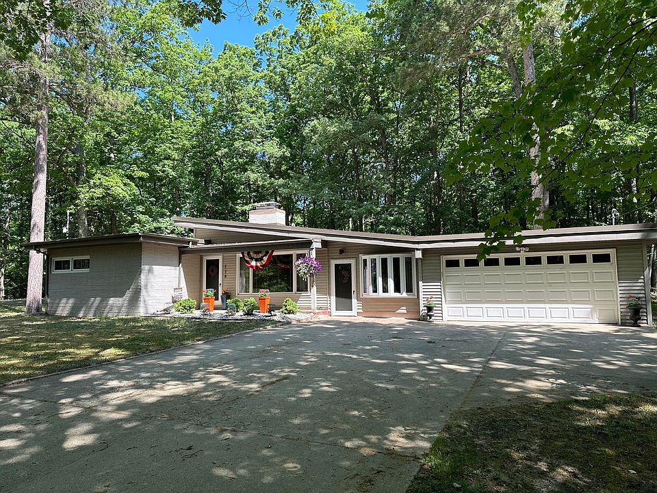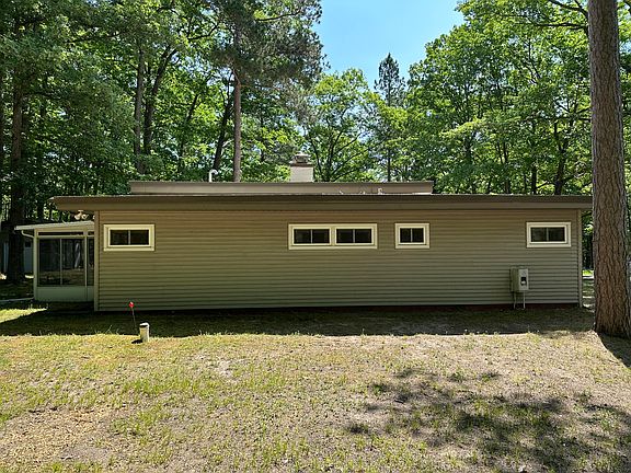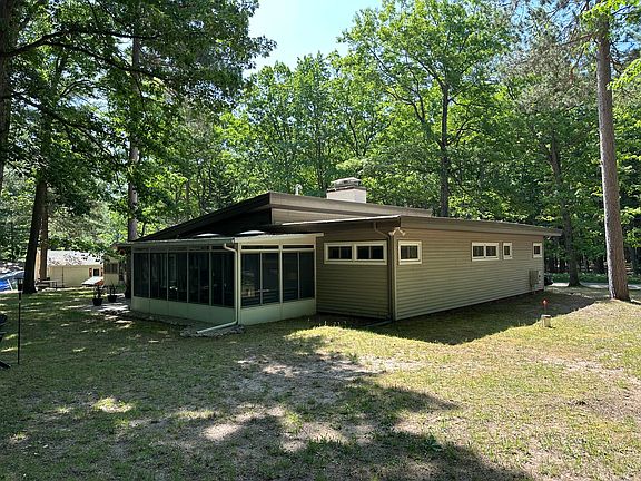 A rare Higgins Lake opportunity to own a Mid-Century gem! This home features a large open living room and dining room with vaulted ceilings, wood paneled walls and a floor to ceiling corner stone fireplace. Specious hallways with adequate storage lead you to three large bedrooms and the main bathroom. The master has an ensuite bathroom and walk-in closet. There is a giant family room for entertaining and a 3 season room off the kitchen perfect for enjoying the natural setting of this home. The clean lines of the home are juxtaposed with that of the new landscaping. An additional wooded lot behind the home is included. The basement has plenty of storage and houses the systems. Many furniture pieces included with the sale. Road end access to beautiful Higgins Lake! No overnight mooring. New paint throughout Dec. 2022 & carpet throughout January 2023