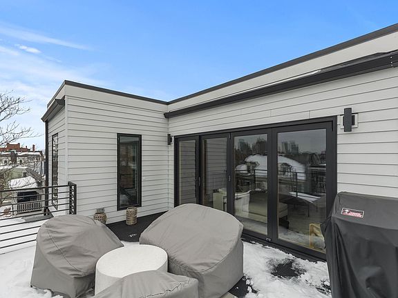 Presenting 228 Webster Street, PH4, in East Boston. An entertainer's dream condo, this unit's open concept layout pairs perfectly with is roughty 200sf private deck, offering a gas line for grilling, scenic harbor views, and a bi-fold door for a true indoor/outdoor living experience. The living room features a cozy gas fireplace, SONOS ceiling speakers (also in the primary suite), and large picture windows. The kitchen is complete with a white Fisher & Paykel fridge & gas oven, gorgeous VIGO faucet, rose gold hardware, wine fridge, a crisp white quartz waterfall island, the list goes on!. This unit offers 2 full bathrooms (including the primary en suite) and 2 spacious bedrooms - the primary bedroom features custom built-in closet storage, W/I closet, and second private deck! Laundry in unit, 1 deeded storage unit, 1 parking space. This won't last!