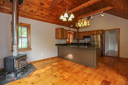 - Kit Dscrp: Flooring - Wood, Dining Area, Countertops - Stone/Granite/Solid, Ceiling - Cathedral, Breakfast Bar / Nook, Stainless Steel Appliances, Open Floor Plan, Wood / Coal / Pellet Stove, Window(s) - Bay/Bow/Box, Exterior Access, Country Kitchen