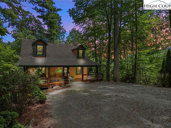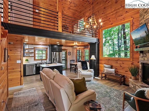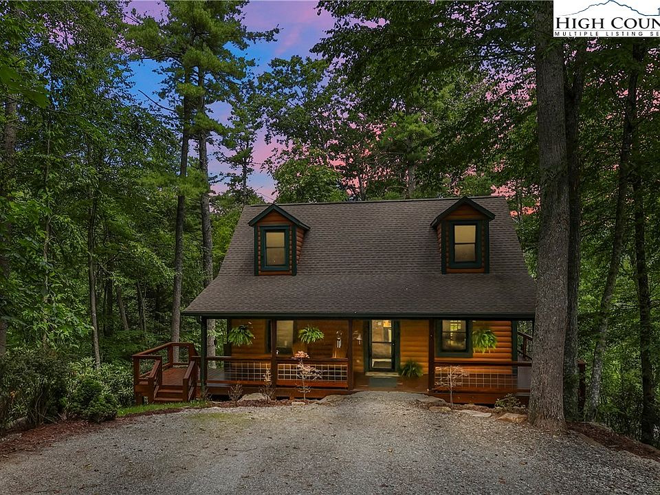 Log cabin with privacy and feel of a treehouse tucked into 1.13 wooded acres just outside of Boone. This classic log cabin offers refined mountain living with beautiful trees in the summer and mountain views in the winter. The 1.5 story layout features an open floorplan with soaring vaulted ceilings and hardwood floors. The main level includes and open kitchen with breakfast bar, quartz counters, newer appliances, plenty of storage, a cozy living area with new gas fireplace capable of heating the entire upstairs, and a spacious bedroom suite with updated bath including heated tile floors and heated towel bar.