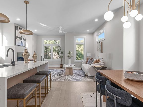 A home that glows with natural light, flows with intention, and connects seamlessly to the energy of the city. This four-story contemporary home was crafted for those who appreciate refined simplicity and seamless flow. Flooded with natural light from oversized Pella windows, the main level offers an open and airy living experience anchored by a sleek fireplace, wide-plank white-oak flooring, and custom brass lighting that casts a soft glow across every surface. The gourmet kitchen blends form and function with warm oak cabinetry, a stunning waterfall-edge quartz island, brushed gold hardware, fixtures, and designer pendants, creating a refined yet approachable heart of the home. Upstairs, the second floor hosts two bedrooms including the spacious primary suite, each thoughtfully designed for comfort and privacy. The primary bedroom connects to a serene ensuite bath with dual vanities, modern floor to ceiling tile selections, and a frameless glass shower. As you ascend, motion-sensor stair lighting guides your path, revealing meticulous craftsmanship and subtle architectural detail along the way. The top level opens to a rooftop terrace with gas, water, and power connections, ready for gatherings beneath the Raleigh skyline. A lower-level guest suite with private entry offers versatility for guests or a home office. Every inch of this home reflects intentional design and timeless style; from the soft neutral palette to precision-trimmed gray doors and contemporary hardware. Ideally located moments from Fayetteville Street, Moore Square, and Raleigh's celebrated dining scene, 228 Woodsborough Place embodies architectural sophistication and effortless city living.