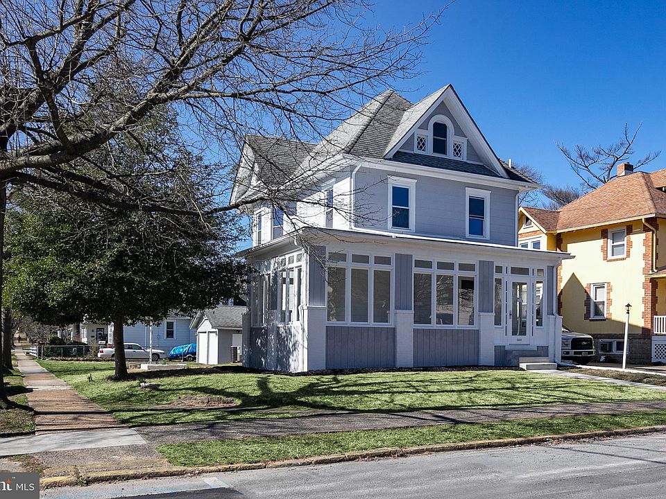 Welcome home to this beautifully renovated three-story, four-bedroom, 2.5-bath colonial on a spacious corner lot in Audubon Boro's sought-after New Jersey community. As soon as you step through the glass door and into the enclosed wraparound porch with numerous tall windows that allow an abundance of natural light to shine in, it's the ideal setting for cozy evenings spent entertaining and a leisurely morning of reading. The open layout of the main floor has new laminate flooring throughout, a bright living room, and a sizable dining area. A large sink, brand-new stainless appliances, custom white cabinets with granite countertops, and an over-the-range microwave are just some of the features of the kitchen. Immediately adjacent to the kitchen is a sizable laundry/mudroom with access to the backyard and a spacious half-bathroom. The newly carpeted second floor has two large, bright bedrooms and a bathroom with a large tiled shower, a vanity, and linen and toiletry storage. Included on this floor is a spacious primary bedroom with plenty of natural light, a bow window area, a vast walk-in closet, and a full bath with a tub. The carpeted third floor has two large bedrooms with craftsman-style windows. This home also has several new energy-efficient windows throughout and a new HVAC system. The detached garage/workshop has the potential to be converted back into a 2-car garage.