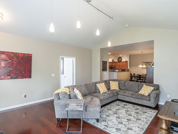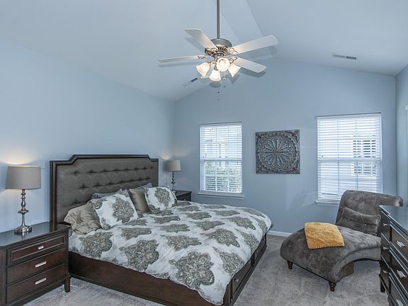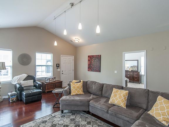 Better'n new, upgraded, cared-for town home/patio-style home. Single floor ranch design is open and inviting; vaulted ceilings in living room and master bedroom, beautiful cherry-toned hardwoods in all main living areas. Upgraded lights, ceiling fans throughout, fresh neutral paint, all very tastefully done. Tiled kitchen, utility, bathrooms; recent carpet in all three BRs. Stainless steel kitchen appliances, double sink, solid surface counters, breakfast bar. Separate utility/laundry/mud room leads to 1.5 car garage - great extra storage. Enjoy a roomy master bedroom suite with walk-in closet; bathroom has garden tub, separate shower, dual sink vanity with cultured marble. Comfy screened porch overlooks a small pond. Great community amenities/recreation center. Welcome home!