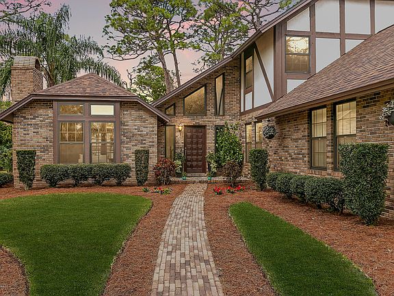Charming Tudor-style home on quiet wooded cul-de-sac lot located in a waterfront community with boat ramp, community dock, and riverfront picnic area! This tastefully updated four-bedroom, three-bath home has much to love! Inviting family room has vaulted ceiling and wood-burning fireplace with attractive brick hearth. Downstairs bedroom can serve as a master suite, MIL space, or family room. Over $100k in recent improvements include new quality storm-rated windows and doors, new wood-plank tiledownstairs, new roof, irrigation system including deep well, and fencing! Relax on the spacious brick floor screened porch as you marvel at the .72 acre impressively manicured lawn. Yard has abundant space to play, park an RV/boat, and add a pool! Close to highly-rated schools and Rotary Park!