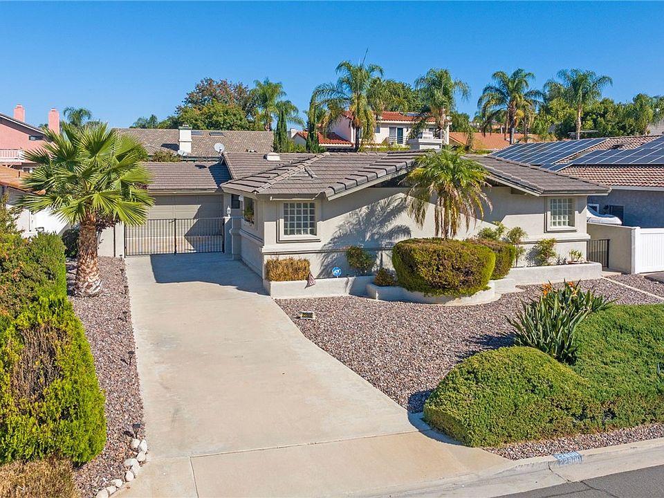 Looking for the perfect move-in ready, affordable home in Canyon Lake? This immaculate single-story home offers three bedrooms, 2.5 bathrooms, spacious living areas and a private back yard - all just a few minutes' walk to the lake. The primary bedroom suite is a serene and light-filled retreat with a slider to the backyard. Both en-suite bathrooms provide plenty of counter & storage space and one features a sunken tub with an atrium - just right for a bit of pampering! Cooking is a true pleasure in this beautifully remodeled kitchen with solid granite countertops & backsplash, modern tray ceiling, and a pass-through window to a bar with mini fridge and sitting area. The seamless flow into the open living and dining areas, which boast soaring wood beam ceilings and a wood-burning fireplace, is ideal for entertaining your guests in style. And don't forget the versatile flex room with a separate entrance – perfect as an office, workout space, or game room. The extra-long driveway provides ample space for parking and a fully finished two-car garage (with attic storage) gives you direct entry into a huge laundry room with more cabinets and a utility pantry. Your private oasis awaits in the low-maintenance backyard with multiple fruit-bearing trees, artificial turf, drains, and full fencing for privacy. This gem comes fully equipped with all appliances, ceiling fans in most rooms, upgraded LVP flooring, crown molding, recessed lighting, newer windows and sliders, newer paint and stucco. Canyon Lake is a 24 hour guard gated community with a private 525 acre lake, premiere wakeboarding and waterskiing, 18 hole SCGA rated golf course, lakefront pool and clubhouse, Lakeside RV Park, equestrian center, tennis, basketball & pickleball courts, baseball fields, 4 beaches, 9 parks, a bicycle pump track, Senior Center, over 40 clubs to join and so much more!