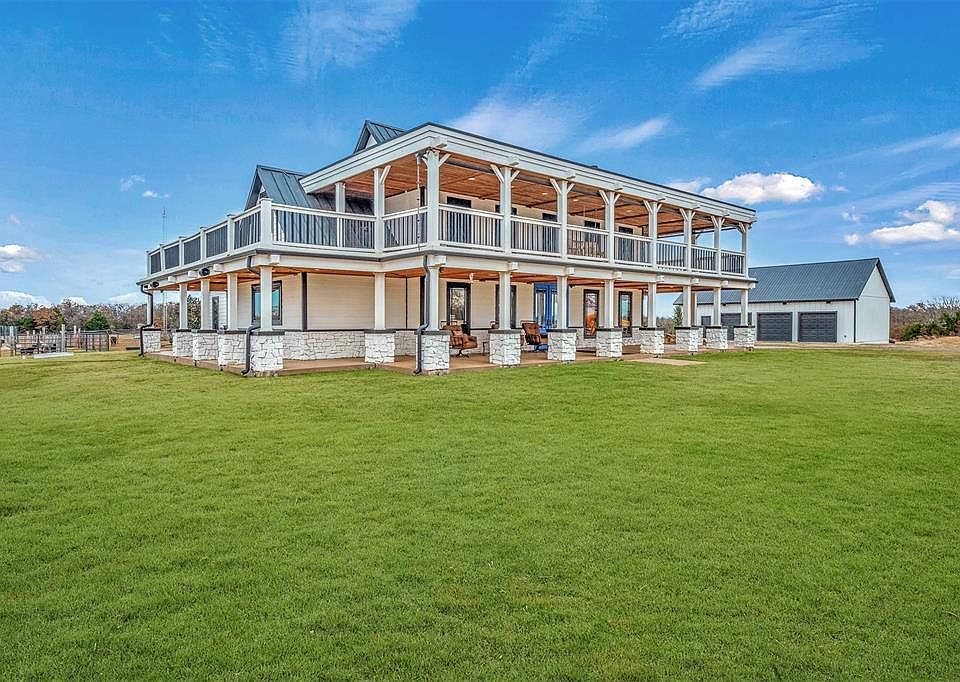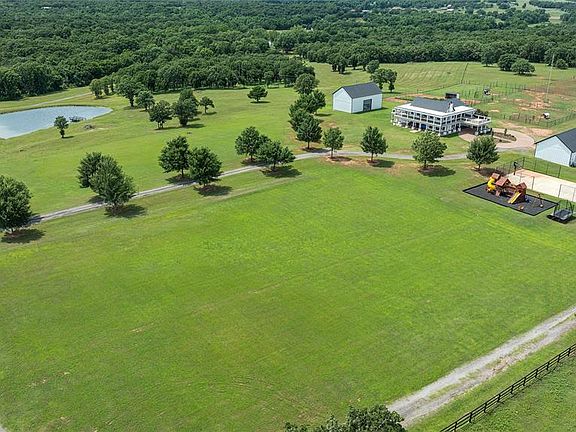A true First Offering situated just 15 minutes from Edmond, near historic Route 66. A sprawling 195 acres of rolling hills surround this one of a kind fully furnished luxury farm house. No expense was spared in the remodel of this stunning property, boasting high end finishes throughout. Recently receiving an award for deployment of technology, the home is equipped with a top of the line Savant home automation system allowing the owner to control the climate, audio, lighting, and more all at the click of a button. The main level is complete with a true gourmet kitchen, vaulted ceilings, expansive open concept living and dining areas, spacious primary suite with attached office space or sitting room, and 2 additional en suite bedrooms. The upper level houses additional living space and bunk room with sliding doors opening to the wrap around porch. Additionally, the detached garage boasts a Full Swing golf simulator with a built-in mini bar, Kaleidescape movie theater, and space for a private gym. The grounds are truly what set this home apart - fully fenced with multiple paddocks for horses or livestock, outdoor basketball court and playground, chicken coop with round pin, 2 fully stocked ponds, detached barn for storage and so much more. Don’t miss your chance to own this one of a kind property, schedule your showing today!