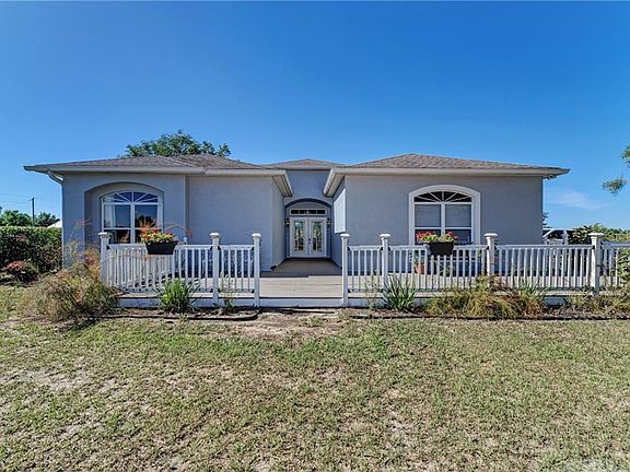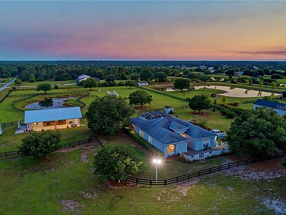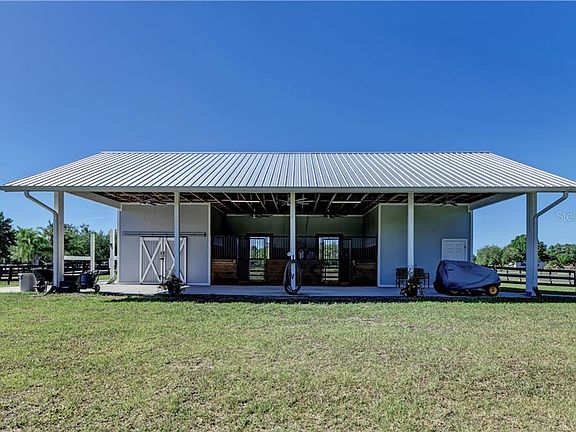Horse lovers! An equestrian estate situated on nearly 5 acres. Your next home awaits as you enter your private entrance with automatic gate and long driveway lined by oak trees. This property has over 3,000 feet of painted, 3-board, hot-wired fencing, featuring a 1.5-acre jump field and 1-acre LED lit front field for night riding. This newly constructed 2-stall barn(will easily accommodate up to 8 stalls or workshop under existing roof) features a hay/storage room, A/C tack room, LED shop lights, Nest cameras/smoke detectors, outdoor wash rack, separate entrance with trailer parking, and more! Each stall has interlocking mats, Saratoga stall doors, easy pour waterers, 5-blade fans, and Dutch doors that lead out to individual paddocks. This beautifully updated home features an open-concept kitchen with wood cabinets, granite counters, and stainless steel appliances. The master suite has direct access to the pool, along with his/her closets, en suite master bathroom with double vanities, soaking tub and separate walk-in shower. Enjoy the night skies from the caged lanai with heated inground pool and spa. Fiber optic high speed internet available. No deed restrictions.