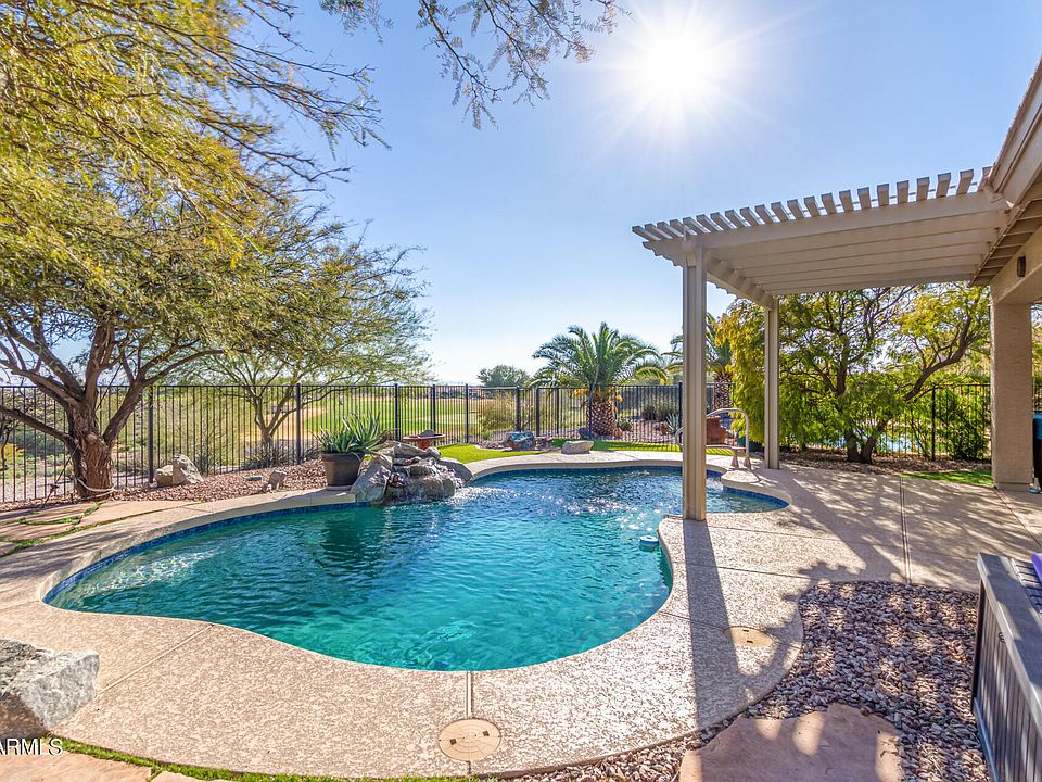 Wow! PREPAID solar lease and POOL and SPA on the GOLF COURSE! The charming interior features a living/dining room w/ tons of natural light, high ceilings, tile flooring, recessed lighting, backyard access, & a wood feature wall. The impeccable eat-in kitchen offers tile counters & backsplash, wood cabinets w/ crown moulding, pendant lighting, sparkling SS appliances, an island, & a two-tier peninsula w/ a breakfast bar. You'll also find an open den ideal for an office. The bright primary bedroom boasts wood floors & a private bathroom w/dual sinks & a walk-in closet. The garage has attached cabinets & GOLF CART area. Enjoy beautiful sunsets in the backyard showcasing a covered patio, SPA, refreshing POOL, artificial turf & golf course views. Make this move-in-ready gem yours today!