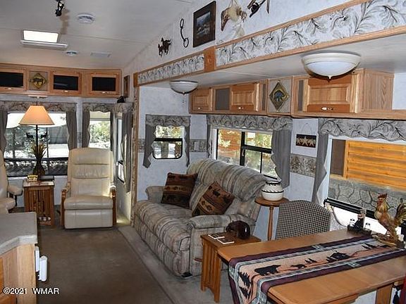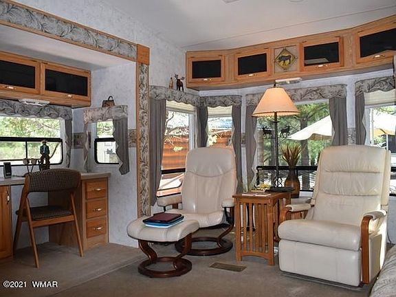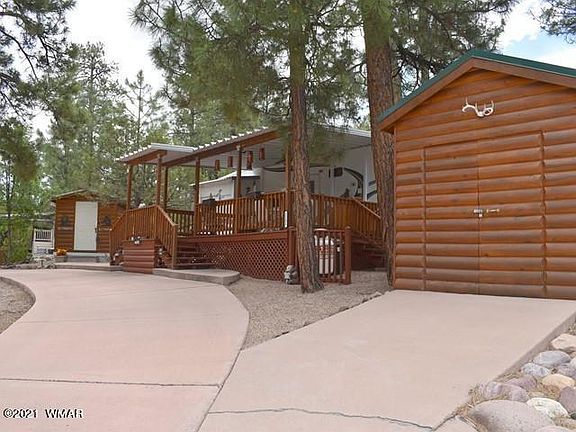 * Tucked in the trees in the highly desirable White Mountain Vacation Village you will find this stunning 5th wheel. Located on a corner with two lots (1 HOA Fee) for plenty of space; outside boasts a concrete driveway and walkways, two storage sheds one with electric, concrete patio with propane fire pit, large front deck to enjoy the 4 seasons, and beautiful landscaping. Inside you will find a well maintained, move in ready home, fully furnished. Living area is spacious with built in desk and entertainment area. Kitchen features Corian countertops and a pantry. Bedroom is roomy with lots of storage. Laundry nook is ready for a washer and dryer. Come take a look today!