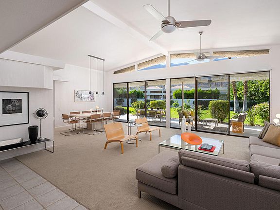 Fall in love with this spacious and airy 2600 sq ft, 3bed/2.5 bath mid-century villa, with stunning Mt. San Jacinto views, in South Palm Springs' coveted Canyon Estates! Past the courtyard, and through double entry doors, architect Charles Dubois iconic tented ceilings highlight the clerestory windows in the open living and dining area. Walls of glass lead out to your huge leisure terrace, where you can entertain or relax while taking in greenbelt and mountain vistas. The updated kitchen is a chef's delight, with ample granite counters, extended cabinets into the breakfast room and newer stainless appliances. The spacious primary suite offers ample closets, including a walk-in and cedar, a vanity area and a huge bathroom with dual sinks, a large soaking tub and a separate shower. Both guest bedrooms are generously sized, with one currently being used as a den, with a built in bar and a separate work from home space. Upgrades such as Owned Solar, a water softener, newer plumbing, HVAC and hot water heater along with a huge 2 car attached garage, completes this perfect picture. HOA dues conveniently include premium cable TV and WIFI, landscaping and all amenities. All the roads in the complex are currently being beautifully repaved as well. Out your door, you'll be living the best country club lifestyle! Stroll through landscaped green areas surrounding 15 pools and 12 spas. Be sure to make some fresh pink grapefruit, orange, tangerine or Meyer lemon juice from the multiple fruit trees scattered conveniently throughout. Two championship tennis courts, pickleball courts, a 9-Hole Par 3 private Executive golf course, along with Dubois' signature clubhouse offering a sparkling fitness center, library, a game room and a large patio overlooking 2 tranquil ponds. Welcome home!
