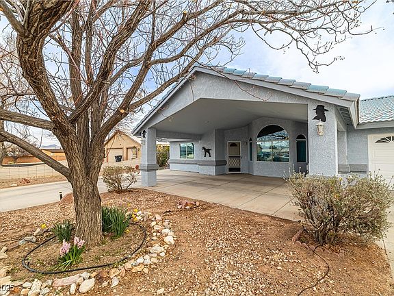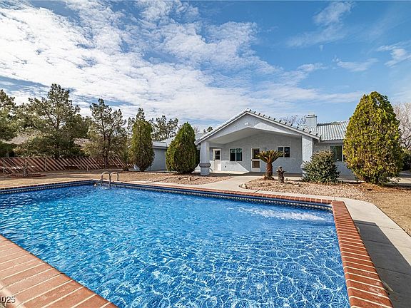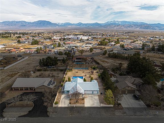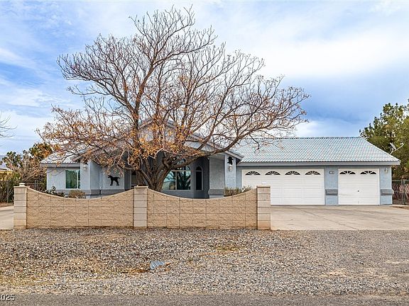 Cute, clean, move-in ready home with a pool!!! 3 bedroom, 2 bathroom 1718 sq ft. Oversize 3 car garage (1061 sq ft) with cabinets, workbench and storage room. Open living room with vaulted ceiling and cozy wood burning fireplace. Updated kitchen with granite counter tops & all appliances included. Kitchen sink sits in front of the window looking out to the backyard and pool. Sparking blue pool (14x28) with a new liner and new pump as of 2025 (maintained by Blue Line Pools). Relax on the covered back patio across from the pool. Fully fenced backyard with mature landscape ready to bloom. Centrally located on a half acre lot with public water and private septic system. Circular driveway with front covered parking and tons of concrete! Plenty of room to park your RV, boat, toys and more! NO HOA. Just a quick commute to Vegas.
