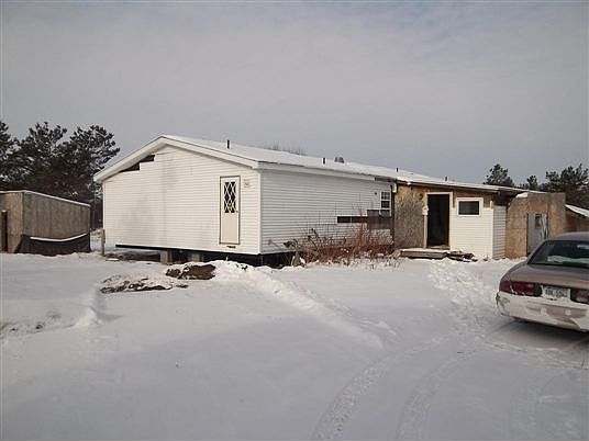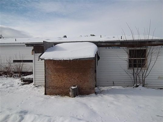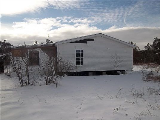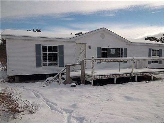 Exterior Features: Siding is white vinyl. Windows are intact. Some soffits present. Noeaves. There is a front porch. Roof is shingled but unable to seecondition due to snow. There is a long, dirt driveway. House is in poorcondition with many holes in the drywall. Interior Features: This is a double-wide trailer without skirting in the country. Three bedroom, two bathroom home. No basement. Kitchen has dishwasher and cupboards present only. Livingroom present. No furnace or hot waterheater in home. All flooring in poor condition and needs replacing. Deck off back of home.