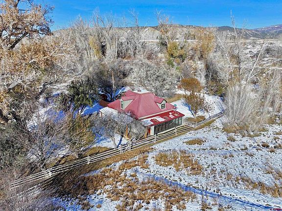Embrace the charm of country living! This delightful farmhouse, set along the picturesque Uncompahgre Road just south of Montrose, is surrounded by mature trees and stunning mountain vistas. A cozy covered front porch welcomes you to this serene retreat. The updated home offers three generous bedrooms, a full bath with a vintage clawfoot tub, and beautiful hardwood flooring in the main living area, which also features a functional woodstove. A second living or dining space provides additional warmth and ambiance with its own woodstove. Touches of the original log cabin construction peek through in a few places, adding a unique historic character to the home. The main level is designed for convenience, with a spacious primary bedroom and a laundry room. The bright, south-facing sunroom offers a tranquil space to take in sweeping views of the San Juan Mountains. Recent upgrades include newer siding, windows, and partial newer roofing for added peace of mind. Outside, the landscaped yard and fenced backyard offer plenty of room to relax or entertain, while a handy root cellar adds functional charm to this picturesque property.