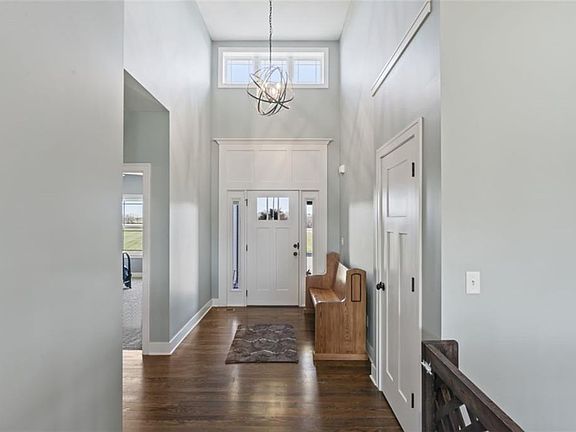 Beautiful, well-kept Reverse Ranch home only 5 years young. Sitting on approximately 6.56 acres in a like neighborhood of homes all on acreage. New roof, gutters & downspouts installed 11-7-23. Nice covered front porch leads to a large entry. Very open concept from the Great Room with gas fireplace to the Kitchen & Dining areas all with hardwood floors. Nice walk-in pantry, large center island with quartz counter, gas stove, plus all appliances staying! Between the kitchen and 3 car garage, is a large, tiled, laundry room with a large dog washing station which can also be used for human feet on those muddy or gardening days. The washer & dryer are also staying! The large, covered deck can be reached through both the dining area & the primary suite. The primary suite offers a double vanity, shower with concrete floor, tile & a large walk-in closet. USB outlets in Kitchen & Primary Bedroom. The second suite is also on the main level. It offers a private bath with shower over tub & a double closet. Half bath with hardwood floors is also on the main level. The lower level offers two bedrooms with walk-in closets, a full bath with shower & a large family room that walkouts out to a covered patio. The larger storage room can be turned into an office, 5th bedroom, craft room or exercise room & an egress window added. This room also has a storm shelter area beneath the above front porch. The 2nd storage area is large & houses the furnace, and water heater. There are raised garden beds in the back! No HOA but there are covenants & restrictions. The main cul-de-sac road in the subdivision is graveled & private but the county has it scheduled to be chipped and sealed in the spring of 2024 at which time they are requesting it become county maintained. The developer who lives in the subdivision currently maintains the road & from the previous sales of the land held the money to do this in escrow. No additional funds from the owners are required.