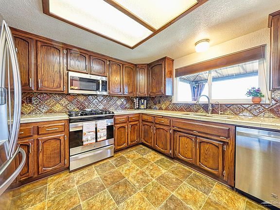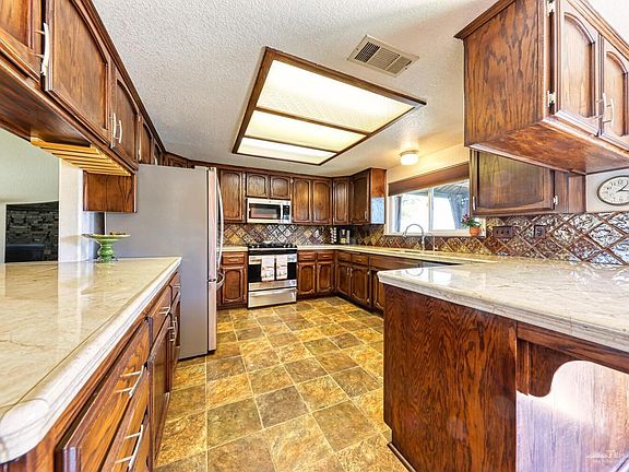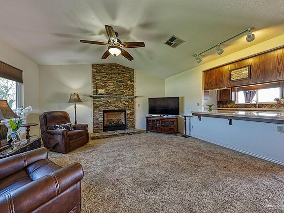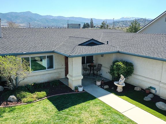 Beautifully updated 3 bedroom 2 bath home with fantastic views and entertaining areas in desirable Golden Hills West location. So much to offer in this property: with upgrades galore and pride of ownership throughout. Remodeled floor to ceiling stack-stoned fireplace and hearth with natural gas burner plus increased efficiency with remote thermostat controlled heat blower. Kitchen updates include new 18'' tile countertops, tiled backsplash, stainless steel appliances, dual sink, gas range and refinished hardwood cabinets. Newer custom windows throughout home (except bath) includes convenient easy-rise solar shades. Bathrooms remodeled. Hallway bath includes granite counters, frosted glass and new fixtures. New vanity replaced in primary bathroom and walk-in shower has new tile finish. Home features nice carpet and vinyl flooring throughout that can withstand high traffic in all seasons. Pantry closet and hallway cabinet are built-ins. Oversized primary bedroom + ensuite with great windows and walk out sliding door leading to an entertainer's dream back patio. Large walk-in closet. Handicap assist bars in shower and toilet.The backyard is perfection with not one but three entertaining areas, with main patio area equipped with an automatic 17'x12' retractable awning cover. Two additional and separate patio areas have attractively sturdy aluminum patio covers with attached lighting and fans, each 12'x12', drawing curtains for privacy and/or pulled back to appreciate incredible views that include the nature park, hiking trails immediately behind this property, and the scenic panoramic mountains beyond. Built-in backyard gas BBQ + outdoor fridge in a finished island with tile top. A most inviting fireplace, a soothing water feature, and nice potted plants and trees line the back patios. The roof was replaced in 2016. Newer whole house water softener system included. Newer hot water heater. Mature landscaping and delightful fruit bearing trees including apple, cherry, pear, and peach. 2 sheds remain on property for additional storage. Side yard features nice 6'x8' shed currently used for equipment storage, plant potting and work area. Second 6'x4.5' shed by gravel area highly desirable for storage out of view. Rain gutters attached. New HVAC system installed spring of 2025.