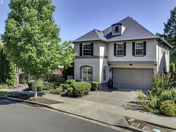 **OPEN HOUSE SATURDAY, 8/2 from 1:00-3:00** 4 bdrms + office. From the gated front courtyard to the green space views, this home blends timeless design with everyday comfort. Large windows, high ceilings, custom finishes & thoughtfully designed living spaces. Architectural details & hardwood floors through-out. Living room w/corner gas fireplace opens to the dining area w/slider to patio. Kitchen features slab granite, eating island, pantry & stainless applcs including, gas 6-burner cooktop, built-in convection ovens & refrigerator. Main level office has French doors & wall of built-ins. Spacious primary suite w/greenspace views, dual w-in closets & tiled bathroom w/dual sinks & soaking tub. Fenced backyard w/extended patio, fire-pit & lovely water feature backs to a greenspace. Central Vac system, auto sprinklers, Nest doorbell & thermostat. AC. Located near schools, parks, shopping, dining & access to I-5 & !-205 freeways.