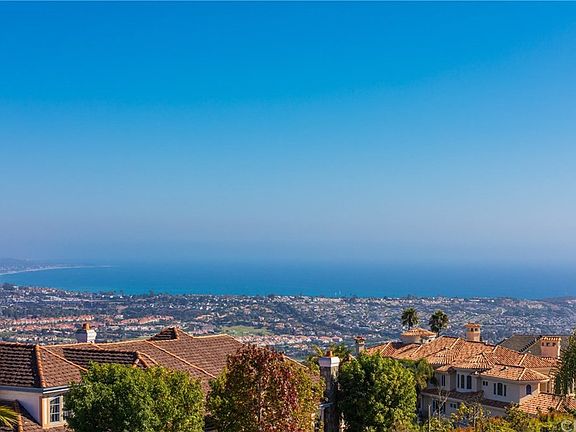 Commanding a prominent Monarch Point site, this custom-built property takes in sweeping vistas including Catalina Island, Salt Creek Beach's surf and neighboring rolling hills. At dusk, thousands of lights sparkle from the legendary coastal towns below. A courtyard driveway sets off the Mediterranean style, five-bedroom residence. European refinement continues in the 30-foot-high entry hall, with polished white marble floors and a wrought-iron balustrade and chandelier. Additionally accessed through the entry hall is a richly paneled library/office. The kitchen showcases stainless appliances amid a chic color scheme with the same pristine marble floors. Upstairs behind double doors, the master suite optimizes the exceptional views. A three-sided fireplace separates the sleeping area from a sitting room with an ocean-view terrace. The suite's planked hardwood floors continue into the spacious master bath, notable for its dramatic veined marble and private sauna. The three remaining upstairs bedrooms are joined by a multi-purpose room with bar that's perfect for entertaining close friends with a game of billiards and relaxing together at day's end. At the rear, a wraparound patio features a fountain, fire pit, built-in BBQ and a bar. Gate-guarded Monarch Point's modest HOA fee not only includes in-home security, but also access to a year-round heated swimming pool, two hot tubs, two tennis courts, plus racquetball and basketball courts. Badlands Park's trails are a block away.