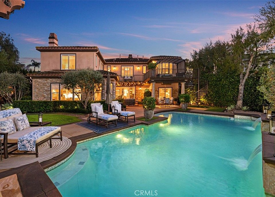 Nestled on a cul-de-sac in the prestigious guard-gated community of Stoneridge, 22826 Driftstone epitomizes luxury living w/ unparalleled elegance & sophistication. Set upon an expansive 11,388 sf lot, this exquisite estate boasts breathtaking vistas of Saddleback Mtns, twinkling city lights, & Lake MV. The backyard resort boasts a magnificent 8ft deep, heated 40t x 20ft saltwater pool & spa. Adjacent to the pool, a charming pergola w/ a wood-burning fireplace, sound system, & heater, creating an enchanting space for al fresco gatherings beneath the starlit sky. Serenity abounds w/ the murmur of 3 outdoor fountains, lending a sense of tranquility to the lush landscape. An an outdoor built-in BBQ island complete w/ a fridge & burners offers the perfect setting for culinary masterpieces amidst the backdrop of mountains & city lights. Meanwhile, a courtyard, adorned w/ two large bi-fold California sliders, and retractable shade provides a seamless transition between indoor & outdoor living, ideal for enjoying the temperate SoCal climate. Adding to the allure is a detached wine tasting room, fully insulated & temp-controlled, boasting vaulted ceilings & housing over 800 bottles of wine. An added feature, the attached storage barn, complete w/ shelving, a sound system, and ample space to accommodate all your storage needs. Ascending to the upper level, a sprawling balcony off the primary bedroom awaits, accessed via a spiral staircase, offering a private sanctuary to savor panoramic views & serene sunsets. Stacked stone veneer envelops both the front & back facades.Inside, the kitchen serves as the heart of the home, exuding opulence with Calacatta marble countertops, a massive island, porcelain farmhouse sink & GE Monogram stainless steel appliances, including a wine fridge & gas stovetop w/ a convenient pot-filler. Custom woodwork, coffered ceilings, & exquisite finishes adorn every corner. The primary bedroom retreat beckons w/ its own private balcony, ensuite bath featuring Emperador marble, a soaking tub, standalone shower w/ a rain showerhead, and a spacious walk-in closet. This retreat space can easily be converted into a 6th bedroom, offering versatility to suit your lifestyle needs. Accesss to all the amenities of Lake Mission Viejo, allowing for endless recreational opportunities. Garage enthusiasts will appreciate epoxy floors and built-in cabinets.Other notable upgrades include a new 75 gallon water heater, AC unit and dishwasher. No Mello Roos!