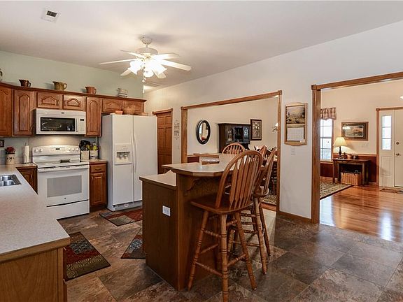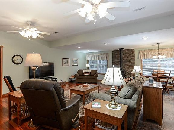 REDUCED! Beautiful one-of-a-kind home with many, many extras, see list. Relax on the front porch and enjoy the beautiful view of the Ozarks landscape. Large open kitchen with eating area. Formal dining room, insulated floors with gorgeous Brazilian hardwood flooring.If you are a car collector or tired to hauling your boat to lake then this property could be for you...Two Shops, 40x50, with 15 foot walls, concrete heated floors with 14 foot power door. Air conditioned office/bar. other shop is 30x40.