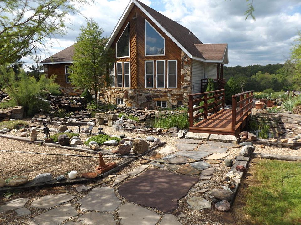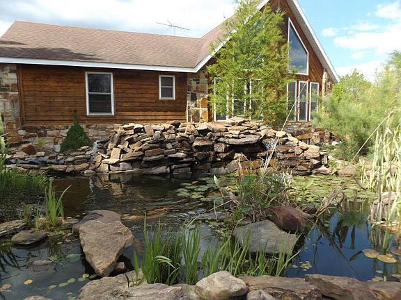 Beautiful home with landscaping galore all on 17.17 acres! 3 separate koi ponds in the front with a small bridge you walk over to enter home adds a unique and lovely feel to the home. Large open living room with tall ceiling and numerous windows overlooking the koi ponds and trees with plenty of natural light, kitchen/dining combo. Loft with a spiral staircase leading up to it for additional room and a private deck overlooking gorgeous views. Large back deck on back, and a walkout basement with a 2 car attached garage. 2 Bedrooms and 2 full baths on main level, and a bedroom/bathroom with a room that could easily be used for another living/bonus room. Long private driveway with trees placed down and around house gives it an extra private feel. Easy access to highway for drive to town.