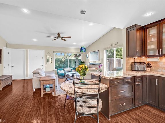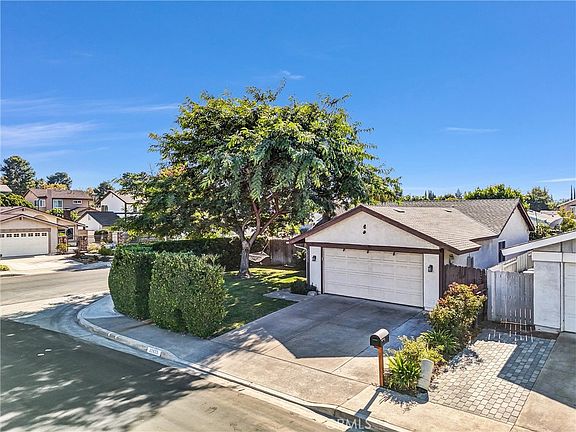 SINGLE STORY DETACHED HOME CORNER LOT IN BEAUTIFUL LAKE FOREST NEIGHBORHOOD CUL-DE-SAC STREET. NO HOA. NO MELLO ROOS, SELLER PAID SOLAR. Welcome to your new modern luxury home with remodeled kitchen and bath, upgraded dual-pane energy efficient windows, laminate wood flooring, fans throughout, central air and heating, new roof, solar panels, tankless water heater, whole house water filter, Ring Alarm and cameras, Smart plugs and switches. Your re-designed kitchen is appointed with the finest granite countertops, new wood style cabinets, elegant tile backsplash, upscale pendant lighting and high-end stainless steel appliances. The kitchen opens to the vaulted-ceiling living room with a stone gas fireplace. The bathroom showcases designer tile, a custom vanity, as well as a cozy heated fan. The front yard is stunning and secluded with plush grass, a large mature tree, and meticulously manicured 7 foot hedges bordering the corner of the yard, giving you extra privacy and shade. In the backyard, you will enjoy a vibrant oasis, with a large grass area, colorful flowers and palm trees, as well as beautiful vines surrounding the covered patio and built-in porch swing. The home sits east-facing with magical sunsets in this quiet and peaceful neighborhood. No detail has been overlooked. Convenient location, close to shopping, dining and freeway entrances. PRETTIER IN PERSON! This one is a MUST SEE!