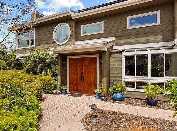 Custom Del Mar Heights home enjoys pure privacy on a tree line street. This 3341 SqFt homes is quality built and well maintained. Upon entry you are greeted by soaring ceilings and stunning contemporary staircase. Main floor master bedroom has high-tech media integration. Upstairs you will find a gorgeous open living room that opens to the deck, 2 more bedrooms (1 built out as an office presently) and another beautiful built in office. Set amongst a mature garden featuring two patios and many fruit trees including lemon, lime, orange, fig, grafted peach of 4 varieties, and apricot. New lifetime roof, purchased solar system with its own electrical panel, newer gutters, furnace, driveway and main electrical panel.