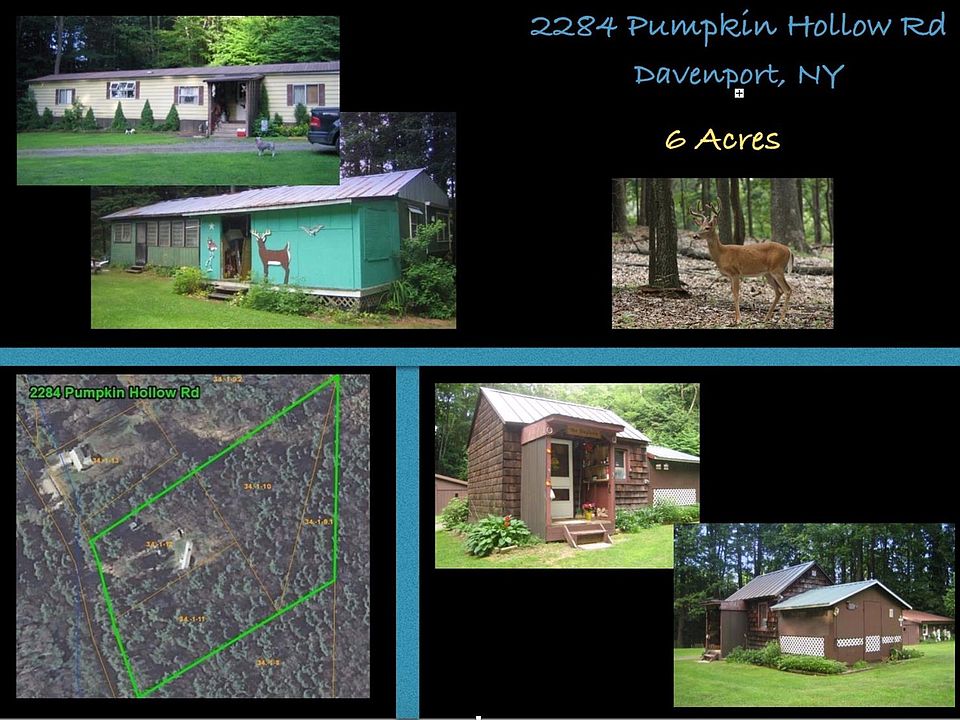 PRICE REDUCED: Perfect for a hunting club, residential use, vacation property, you decide. Nestled in the woods, just a few minutes to Oneonta this unique property has lots to offer. Two single wides, a small cabin, Pavilion, screened building, garden shed horseshoe driveway and 6+/- acres of woods, peace and tranquility. Private and secluded. Time Warner Cable! Call today! 4 tax map parcels included; 34.-1-9.1, 34.-1-9.10, 34.-1-9.11, 34.-1-9.12