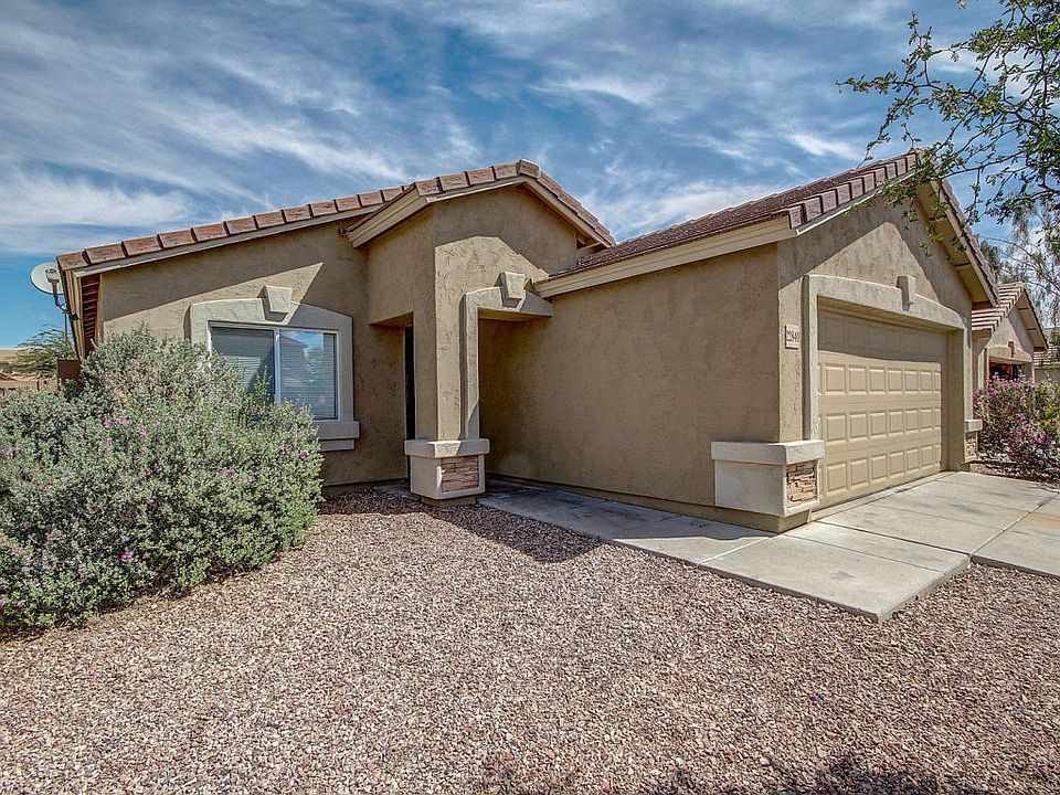 Absolutely Charming, move-in ready home with low maintenance desert landscaping. Create a feast with family and friends as you gather in the spacious eat-in kitchen, featuring white appliances, pantry, and oak cabinetry. Crisp interior palette boasts beautiful tile floors, new plush neutral carpet in all the right places and ceiling fans throughout. Arcadia Doors in the Great Room open to the covered backyard patio and desert landscape, a blank palette for your creativity and imagination. This home is truly a must see ''gem'' in the desert!