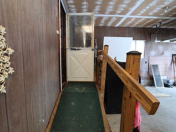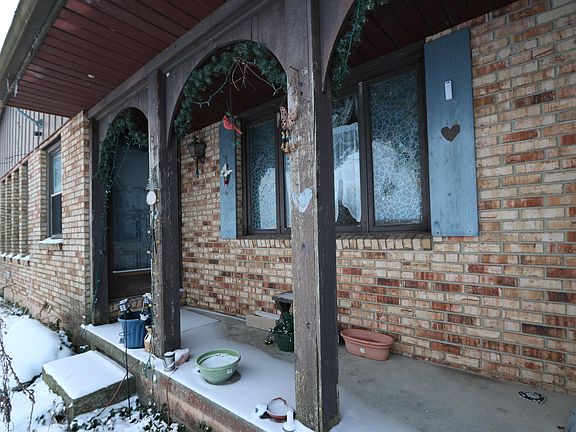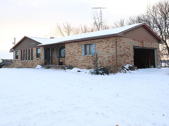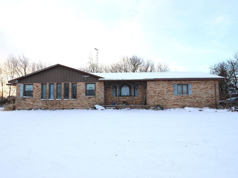 Spacious brick ranch offering a solid layout, unique character, and endless potential. The long covered front porch with rustic wood accents creates a welcoming first impression. Inside, the living room is filled with natural light from a wall of windows and features wood-beamed ceilings, classic wood paneling, and a stone fireplace that anchors the space. The kitchen offers ample cabinet and counter space with a functional layout ready for personalization. Multiple living areas provide flexibility for entertaining, hobbies, or everyday living. The finished lower level includes a large rec room and bar area, adding valuable additional space. Set in a peaceful country setting with mature trees and open surroundings, this property offers privacy, room to grow, and an excellent opportunity for buyers looking to customize a home with strong bones and distinctive features.