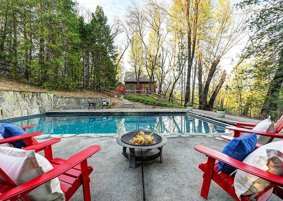 Charming Chalet with Treehouse Views in the Foothills! Feel like you're on vacation everyday in this beautiful, bright home on 3.8 acres in desirable Meadow Vista. Enjoy summers poolside or entertaining on the new wrap around composite deck. The open floor plan with vaulted ceilings and multiple french doors allows for light and sunshine with treetop views from every window. Newly remodeled kitchen boasts double ovens, gas stove top, butcher block island and quartz slab countertops. Upstairs primary suite with spectacular vaulted ceiling, private balcony, loft/office, full bathroom. Large, private bonus room/bedroom with skylights and en-suite bath. Adorable main floor bath features a clawfoot tub. NuCore LVP flooring. Large built in pool is propane heated with a retracting vaulted cover. Unfinished pool house with plumbing and electrical has ADU potential. Low-Maintenance landscape w/sprinkler system. Circular, paved driveway with plenty of parking and RV storage!