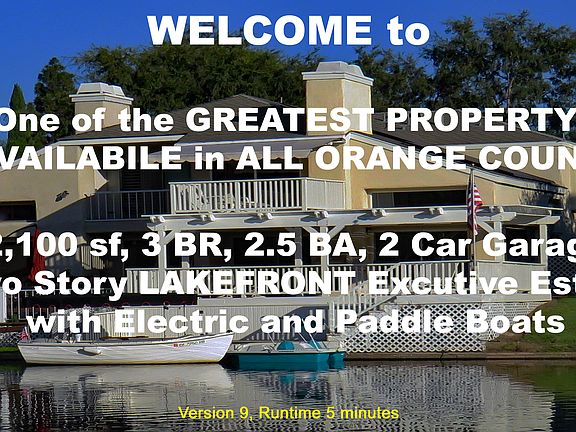 FURNISHED 3 BR, 2.5 BA, 2100 SF, LAKE HOUSE with BOATS and AMENITIES VACATION, RETREAT, RESORT AMENITIES Short Term Rental (Long Term Negotiable) Furnished w/ Utilities, Internet, Cable TV, Lake and Boats Beautiful waterfront / lakefront home with electric boat and paddle boat, 22851 Ridge Route Ln, Lake Forest, CA 92630. Home is available now. The living area is spacious with open views, vaulted ceilings, and two fireplaces. The home is two story, 3 BR and 2.5 BA, 2100 SF. The master has a queen motion bed, fireplace, a 65" big screen Smart TV, and a balcony patio with a view of the lake. Bathrooms are newly remodeled; the master has a built-in mini-fridge and microwave. The second bedroom has a queen bedroom set, attached patio, and large closet. The third bedroom has office furniture and space for another bed. It also opens onto a patio. The second and third bedrooms share a bathroom with a shower and Jacuzzi tub. Linens are also supplied. The den/TV room has an 84 curved Smart 3D TV, recliner sofa, leather couch and plantation shutters. The kitchen is fully equipped, has Calphalon and many upgrades: built-in, counter depth appliances; granite countertops; a bar for seating; new cabinet doors, drawers, and pull-outs; new tile backsplashes; and a tile floor. Carpeting throughout is new. The main deck is oversized with a natural gas BBQ, patio furniture, and plenty of room for entertaining. The adjoining boat dock easily accommodates the 16-foot electric boat and new paddle boat that come with the rental. The 2-car garage has a finished interior, workbench, storage cabinets, and washer-dryer. The garage floor is epoxy coated with a carpeted entry to house. The driveway has stone pavers and will accommodate two visitor cars, street parking also available. The house is very GREEN , equipped with Solar Power and LED lighting, greater than 60% ecological burden reduction. The clubhouse is an easy walk or boat ride from the home. It has three pools, a lifeguard and adult pool with a bar. The lagoon has a sandy beach, water slide, and floats. There are six lighted tennis courts, regular tournaments, ball machines, and instructors available. Other amenities include: a spa, gym, volleyball court, basketball court, paddle ball courts, staffed lobby, greeting rooms, dance floor, and a kitchen. The upper level has a bar with fireplace, glass wall views, and pool tables. Monday night football and Karaoke on Fridays. The home is conveniently located; a short walk to Albertsons, CVS, restaurants, and the beach bus. It is close to the Irvine Spectrum, Laguna Beach, and Dana Point; and all the Orange County attractions. A small dog may be considered with +$500 deposit. Sorry, no smokers of anything. This rarely available home is turn key, move-in ready. True resort living at an affordable price. Slide show available on request. 7d FURNISHED 3 BR, 2.5 BA, 2100 SF, LAKE HOUSE with BOATs and AMENITIES