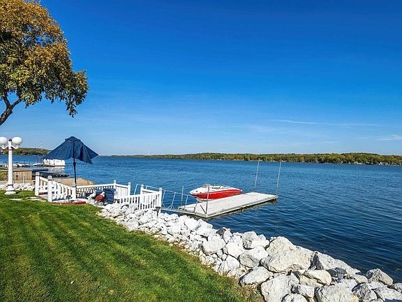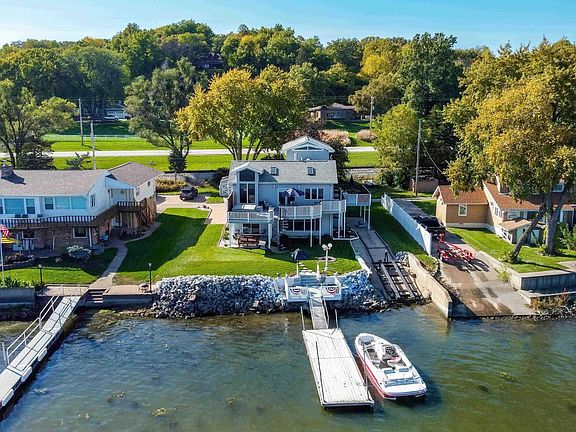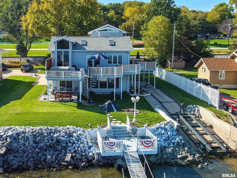 A boater's paradise in LeClaire, Iowa on the Mississippi River! Awesome location between LeClaire and Princeton with 100' of water frontage with deep water, boat dock, and trolley lift on the boat ramp. The home has been expanded over the years and now includes 3 bedrooms plus den/office, a possible additional basement bedroom, 4 full bathrooms, and an expansive upper addition with a HUGE primary suite, private bathroom, and incredible river views all the way to Princeton Beach! The open concept great room is light and bright with vaulted ceilings, large windows, and a gas burning fireplace. The large decks are made for entertaining with ample space for guests and a hot tub, too! The fully finished lower level offers a cozy rec room with a 2nd gas fireplace, bedroom/laundry room, a pool table (stays with home), and a full bathroom that's handy when coming off a day on the river! Many updates in recent years include vinyl siding, roof, new carpet throughout, new skylights, many windows, granite countertops and more! Don't miss your chance to own this piece of riverfront paradise! PV Schools and county taxes. Seller is related to listing agent. Home also has main level laundry hookups, if preferred. Listing agent related to seller.