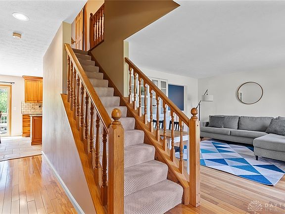This classic yet modern 4BR, 2.5 bath home in popular Hunters Ridge has a finished basement and blends functionality with style and character. 2128 sq ft + 668 sq ft finished in the basement = 2796 sq ft total. You will love the curb appeal with mature landscaping, pretty flowers, and fresh mulch on this .35AC cul de sac lot. The exterior features include: nice sized deck, storage shed, playset and no neighbors directly behind the house. The formal living room is connected to the dining room with a board and batten accent wall. The first floor includes a coat closet, 1/2 bath, and mud room with custom built in storage / shelves / bench with coat hooks. The kitchen features granite countertops, island, pantry with sliding doors, gas stove, updated refrigerator / dishwasher / microwave and is open to the breakfast area and family room with crown molding, ceiling fan / fireplace with new surround & added power source / internet hookup above it for the TV. The primary bedroom is freshly painted in a neutral color with updated ceiling fan and additional lights, and has a renovated ensuite bathroom with shower and vanity with double sinks, and a beautiful walk in closet with custom built ins, new light fixture & pocket door. The 3 secondary bedrooms have ceiling fans and ample sized closets. The upstairs hall bath has also been remodeled. The finished basement has a laundry room with a utility sink and storage space, extra storage closets, surround sound with speakers and a large mechanicals / storage room that is big enough for a workshop. Refer to the home details for the list of updates. Great location: close to Hunters Ridge / Rotary Parks, wetlands, bike trail, hiking, fishing ponds, OH-35, shops / restaurants / entertainment. Just ~15 min to WPAFB, WSU and Soin Hospital.