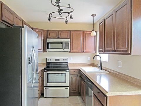 Professionally remodeled 4 bedroom, 2 bath bi level in quiet tucked away neighborhood. Brand new eat-in kitchen with tile floor, raised panel cabinets, solid surface counter tops, eating nook with new vinyl sliding glass doors & stainless & black appliances including smooth top range, built-in microwave, dishwasher & side-by-side refrigerator with water & ice in the door. 2 brand new baths both with tile flooring & designer tile accents. New carpeting & tile flooring throughout. New hardware & faucets. New lighting throughout. New electrical panel. New vinyl windows. New white 6-panel doors. New furnace. New hot water heater. New garage door with opener. Fresh paint both inside & out. New 12x10 deck. Rear patio. 1 1/2 year old roof. New front yard landscaping. Totally fenced yard. Enclosed dog run. Off street parking for cars or R.V.