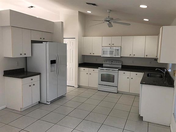 Spacious, light & open. Ample kitchen. Formal Living and Dining rooms plus a Family Room. 3 bedrooms and 2 bathrooms w/split plan for extra privacy. Master Suite has 2 large walk-in closets, double vanities, soaking tub & separate shower. Newly painted, new bedroom flooring, and new refrigerator. Large, tiled, screened & covered patio. Two-car garage. Accordion shutters. Backyard is hedged for privacy. Trellised archway leads to community amenities. Gated community w/pool, clubhouse, fitness room & 2 lighted clay tennis courts. annual
