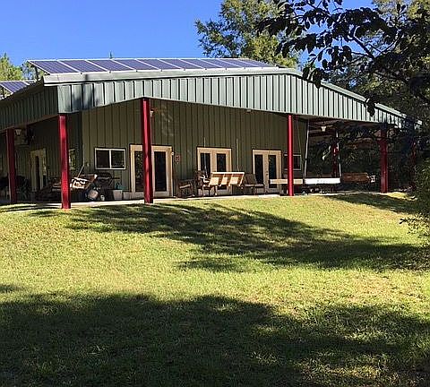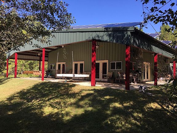 Hidden inside 56 Enchanted Forest acres, this two-bedroom (each with its own built-in full bath), nature-windowed Great Room, solar-metal prototype home was created from a 3200 sq. ft. reinforced steel, 40' x 80' building designed for fortress-level strength, maximum energy efficiency and ultra-low maintenance. Built to withstand 120 mph wind gusts, it features a 9.9KW rooftop solar array that drives a negative power bill (the power company pays the owner, not vice-versa). A unique Solar Foil ceiling extends natural daylight inside this home. A 1600 sq. ft., drive-thru garage includes four, 10' x 10' roll-up doors (two are motorized) to easily store vehicles of all shapes and sizes (cars, trucks, tractors, RVs) and handle a variety of business/agricultural needs. Sporting a perma-paint skin, galvalume metal roof and 1480 sq. ft. concrete surround-porch, this one-of-a-kind home and its .7-acre pond form the centerpiece of a natural wildlife habitat. Wooded trails lead to a variety of hidden gems, including a 1 acre, irrigated food-growing plot, four acres of mystical wetland, two small rain ponds (in addition to the .7-acre pond with its own, electrified "party shelter"), a large green shelter, an underground irrigation system, and two deep Wells (one 5 hp and one 1.5 hp). Home's measurements all in one space: 40' x 80' x 12', with 15' foot deep front porch and 8-foot deep side porches 40 feet down the sides. Roof is 2:12 Pitch. There are a total of six sets of sliding glass doors. All residential-side windows are 100% covered (no "rain/sun" wear-and-tear) by this home's surround-porch.
