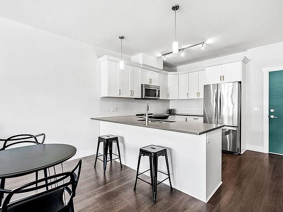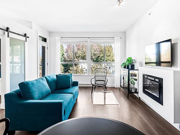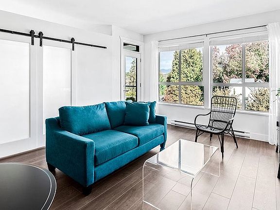 Top Floor Unit w/ soaring 9' ceilings, oversized windows & NW corner balcony capturing an expansive, treed outlook toward the mountains. This unit has been meticulously cared for by its owner and is in immaculate condition. The home features a NY loft style layout w/ the bedroom space separated with a large barn-door.The house-sized kitchen overlooks open living/ dining area & boasts quartz seamless countertops, s/s appl package, 2 y/o washer/dryer & all-wood white shaker style cabinets. AMANTI is walking distance to the new Community Centre (w/ gym & pool), West Coast Express, Traboulay Trail, City Avenue Market, Patina Brewing Co., Caffé Delish and Samz Liquor Store. 1 pkg & 1 locker. Rentals & pets allowed.