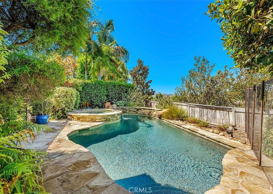 Welcome to the landscape designer's panoramic view home! You know the one: 4-bedrooms, an extra-large lot, at the end of a cul-de-sac, highlighted by a sparkling pool, spa, rock river, and outdoor fireplace, with flagstone and fully mature vegetation adorning it. As you enter through the custom Dutch door, the floor plan opens up with soaring ceilings, dual pane windows, and recessed lighting throughout. The updated kitchen includes French country cabinets, solid-surface counters, stainless-steel appliances, and views out to the lush backyard. The downstairs floor plan is completed by a separate family room, dining room, and updated powder room. Upstairs, the primary bedroom's ensuite bathroom has dual-vanity sinks with new hardware, new mirrors and lighting, and a walk-in shower with new shower door. The upstairs also includes three more generously-sized bedrooms and a second full bathroom with details like custom lighting and shiplap walls. This home has been lovingly cared for from the long-lasting aluminum patio cover to the PEX piping throughout. And if you get tired of your panoramic view or heated pool, explore your Woodleaf neighborhood, one of the most walkable areas in Orange County, a stone's throw from Mountain View Park and its tennis courts, basketball court, and tot lot, or take a quick walk to all of the many restaurants and stores nearby. 15 minutes to John Wayne Airport and 20 minutes to the beach, your oasis is conveniently and centrally located. Don't miss a chance at your slice of paradise before it's lost.