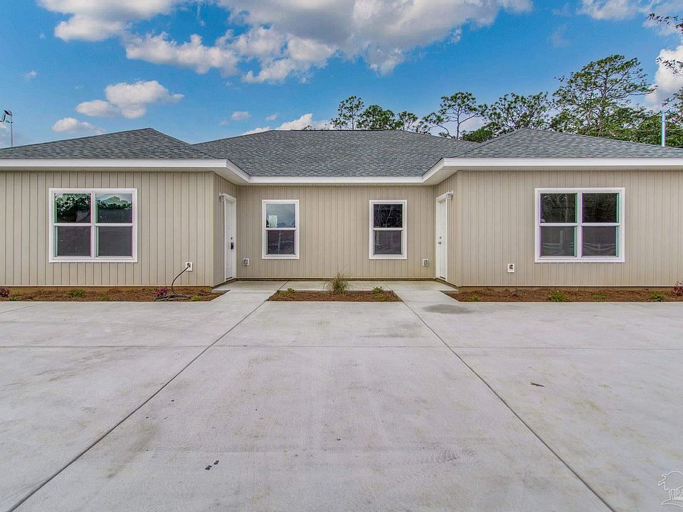 Construction is now complete on this exceptional new duplex! **PLUS** the seller is offering $9,000 in "Anyway Money," which can be used toward a 2/1 rate buydown, closing costs, or nearly any way the buyer chooses. This high-quality, thoughtfully designed property stands out with two bedrooms, two full bathrooms, and over 1,000 square feet of living space per unit. Conveniently located less than 10 minutes from the back gate of NAS Pensacola and under 15 minutes from Perdido Key, it offers both a prime location and excellent investment potential. Whether you plan to live in one side while renting the other or are searching for a low-maintenance, income-producing property, this duplex is a rare opportunity. Inside, the split-bedroom floor plan maximizes space and functionality, while the open-concept living area and well-appointed kitchen provide an inviting atmosphere. The kitchen features granite countertops, ample cabinet space, and Frigidaire stainless steel appliances. The nearly 300-foot-deep lot backs up to a wooded area, ensuring a peaceful and private setting. Designed to blend seamlessly with surrounding single-family homes, this duplex offers both curb appeal and long-term value. High-end finishes include Corelock 7.25-inch wide 20-mil LVP flooring, JSI Cabinetry Premier Series Amesbury White Shaker Maple Cabinets with 42-inch wall cabinets and crown molding, Delta plumbing fixtures, GAF Timberline 40-year architectural shingles, impact-rated exterior doors, and All-American REHAU double-pane white vinyl windows with impact covers. Move-in ready and built with quality craftsmanship, this property presents a unique opportunity for homeowners and investors alike.