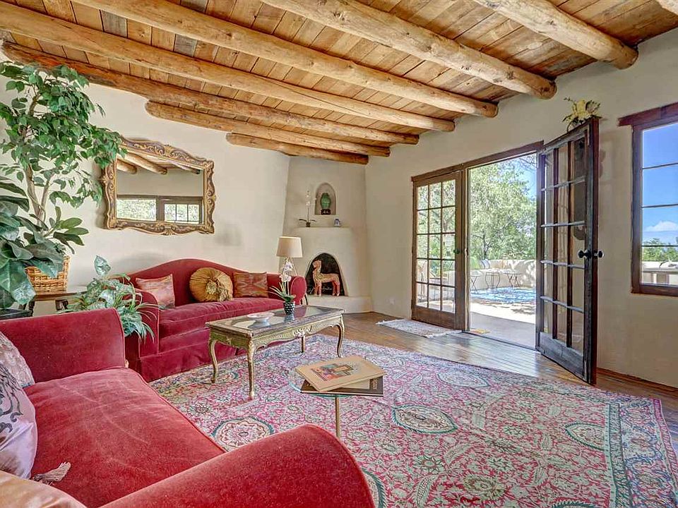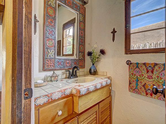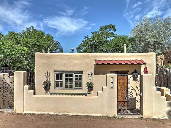 Historic adobe meets Boho chic in this recently beautified home on "Banana Hill." Newer roof, stucco, electrical, plumbing, appliances and paint. Original wood floors, vigas, talavera and saltillo tile. Two separate kitchens make this home ideal for short term rentals with NO HOA FEES. Home features a large tree lined balcony with a view of distant mountains and downtown Santa Fe. This charming quintessential Santa Fe style home includes all furnishings. Don't miss this rare opportunity to own this turn key designer furnished home.
