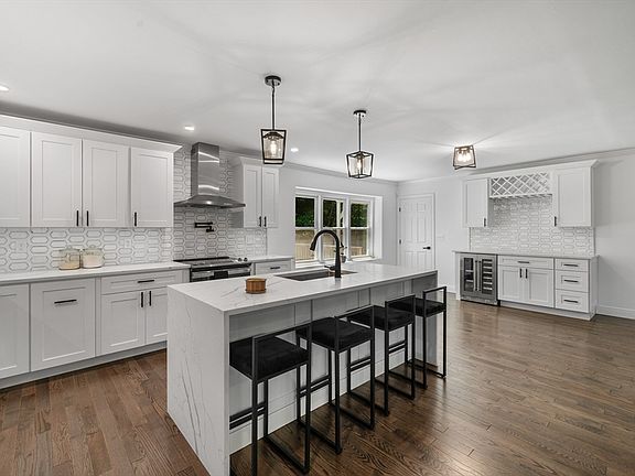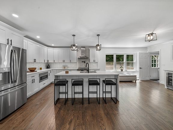 Welcome to this fully renovated 5-bedroom, 4-bathroom contemporary home, featuring a versatile floor plan with exquisite ambiance and abundant natural light. Situated on 3.69 acres, it boasts a wide driveway and convenient entry from a 2-car garage. The foyer, with a built-in hall tree, opens to a spacious concept enhanced by sleek modern finishes. The kitchen offers white cabinetry, stainless steel appliances, and a center island with a waterfall quartz counter, adding both inspiration and style. A chic chandelier illuminates the adjacent dining room with an elegant glow. The five bedrooms provide ample space for everyone, with the option to set up a home office. The home features three fireplaces, soaring ceilings, hardwood floors throughout, central air conditioning, and a brand-new septic system. This dream-like home combines rustic elegance with a convenient location and provides ample privacy—a must-see!