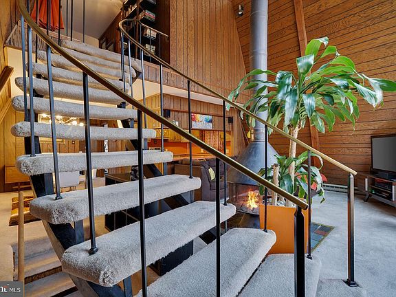 STUNNING CHALET-STYLE WITH BREATHTAKING STYLE VIEWS IN THE HEART OF THE POCONOS WITH A MID CENTURY MODERN VIBE... Nestled against the serene backdrop of state game lands, this UNIQUELY designed 3-bedroom, 2.5-bathroom home offers the perfect blend of luxury, comfort, and nature. With no neighboring homes behind you, enjoy total privacy and unparalleled tranquility, all while being just minutes away from Big Boulder Ski Resort, Pocono Raceway, Lake Harmony, Mt. Airy Casino, and all the best Poconos attractions. As you step inside, you're greeted by an open concept floor plan that seamlessly integrates the living, dining, and kitchen areas. The centerpiece of the living room is a stunning carousel-style, free-standing wood-burning fireplace, perfect for cozy evenings. The reclaimed railroad track staircase adds an architectural touch, bringing history and charm to the home. The kitchen and living spaces offer beautiful views of the surrounding landscape, visible through large windows and from the expansive back deck—ideal for entertaining or simply soaking in the peaceful surroundings. Two brand-new decks provide ample outdoor space for relaxation, dining, or enjoying the scenic vistas. The master suite is a true retreat, with a spacious layout and an en-suite bath featuring a specially insulated soaking tub that keeps water warm longer. The downstairs bathroom includes radiant floor heating for extra comfort. The basement is designed for relaxation and entertainment, with a full bar, sauna, and Bluetooth-enabled fans and lights that let you stream music throughout the space. The downstairs also features a unique river rock wall with a built-in fountain, adding a touch of tranquility to your home. Outside, the freshly painted exterior and two-car garage are complemented by a beautifully maintained home, and with direct access to the surrounding nature, you'll have the perfect mix of modern convenience and rustic charm.