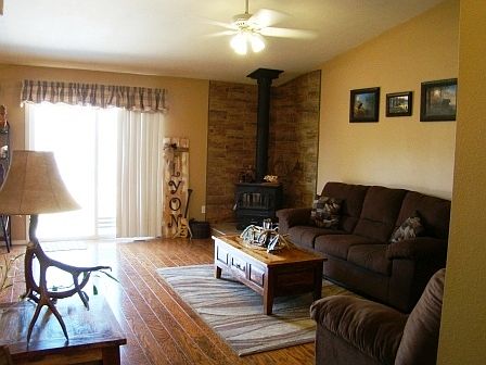 - LIVING ROOM: VAULTED CEILING, CEILING FAN, WOODSTOVE