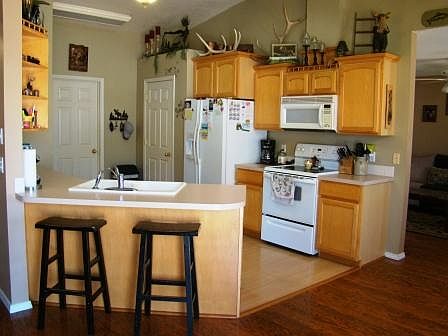- KITCHEN: GARBAGE DISP, REFRIGERATOR, PANTRY, MICROWAVE, DISHWASHER, WOOD CABINETS, BREAKFAST BAR, ELECTRIC RANGE