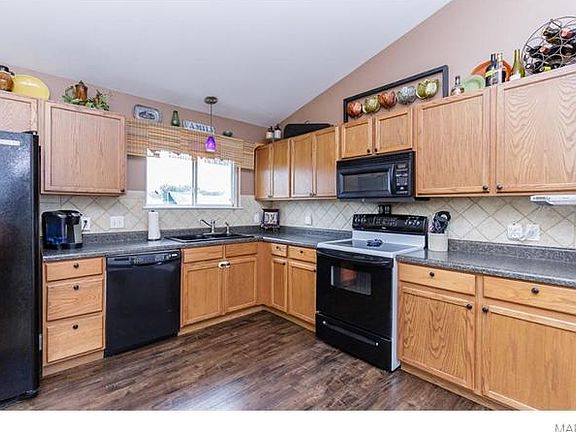Stop the car!!!! Come see this cozy 3 bedroom 2.5 bath ranch home in the Wentzville School District. Vaulted ceilings in kitchen and living room. Wood burning fireplace, plant shelves, gorgeous laminate flooring and 5 1/2 IN Baseboards throughout livingroom, kitchen, hallway and master bedroom. 6 panel doors, custom paint, tile backsplash in kitchen, black appliances, ceiling fans in all bedrooms and updated fixtures throughout the home. Large main floor laundry room. Partially finished basement with large rec/family room, half bath and bonus room with closet that can be used as sleeping room, game room or play room. Great curb appeal, covered front porch, beautiful landscaping and level backyard with large patio make this home a must see!!! Sellers are offering a 1 Yr. HSA Home Warranty for buyers piece of mind.... See today before the sign reads SOLD!!!