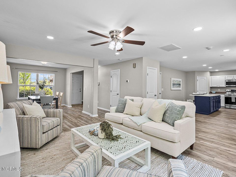 Recent updates include a new HVAC system (2022), a new roof (2021), modern LVP flooring, upgraded lighting, and an oversized kitchen island. The main level features the kitchen with a breakfast nook or dining area that flows into the large living room. Plus, an additional flex room and a powder room provides quick access for guests.